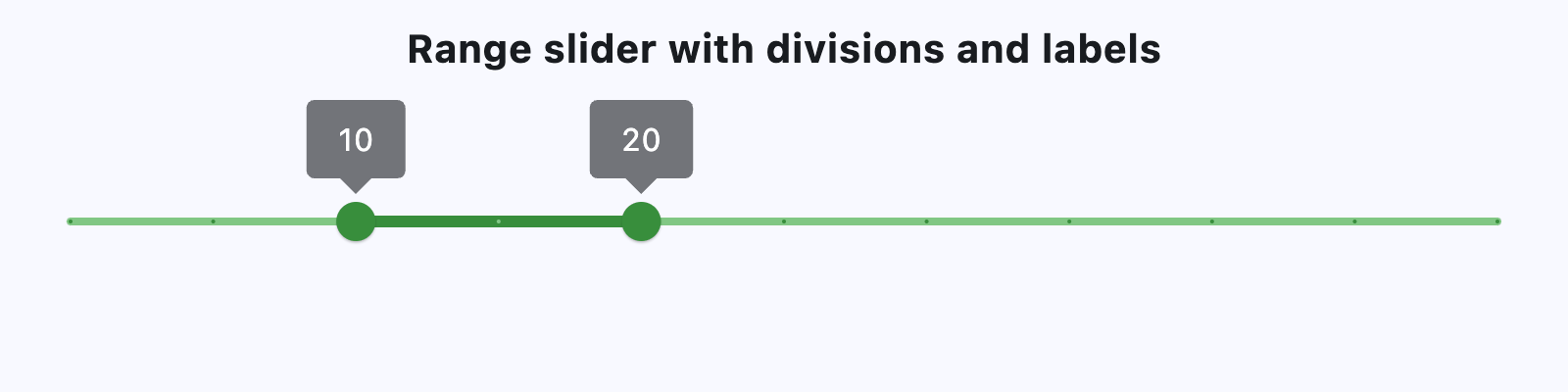 A Material Design range slider. Used to select a range from a range of values. A range slider can be used to select from either a continuous or a discrete set of values. The default is to use a continuous range of values from min to max.