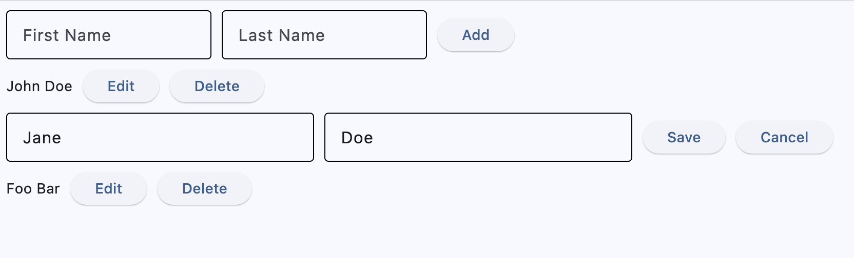 The behavior in both examples stays the same - in the app you can see the list of users, add user, inline edit with save/cancel buttons and delete. This is how this simple app looks in both examples: